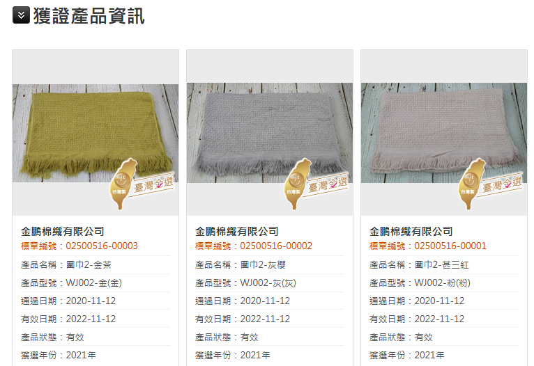 金鵬-膠原蛋白三合一圍巾,榮獲2021MIT臺灣金選。
